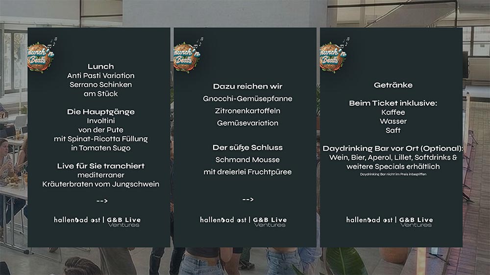 • Inklusive: Umfangreiches Brunch-Buffet (Funk Food Factory), Live-Cooking, Kaffee, Tee, Wasser & Saft sowie das DJ-Set von DJ Marlin.