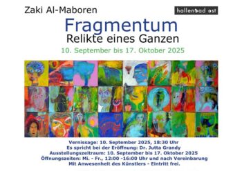 Vom 10. September bis 17. Oktober 2025 präsentiert der Kasseler Künstler Zaki Al-Maboren seine neue Ausstellung Fragmentum – Relikte eines Ganzen im Hallenbad Ost. Die Vernissage findet am 10. September um 18:30 Uhr statt, zur Eröffnung spricht Dr. Jutta Grandy.