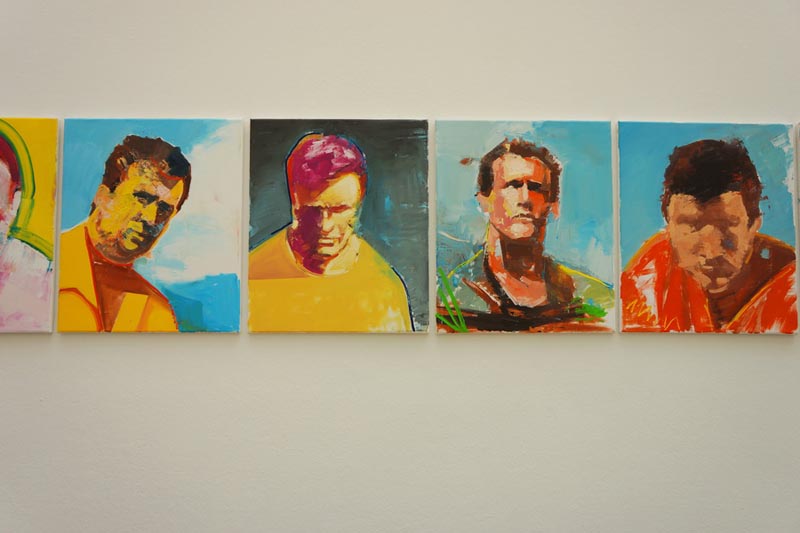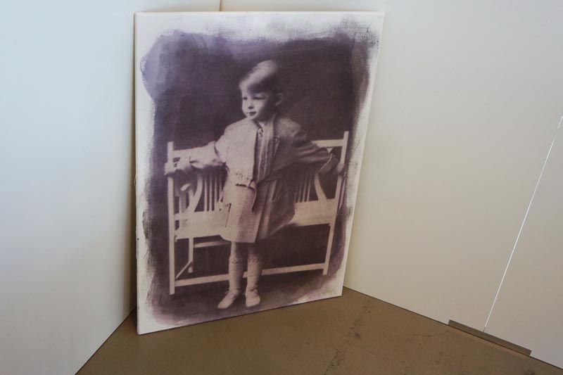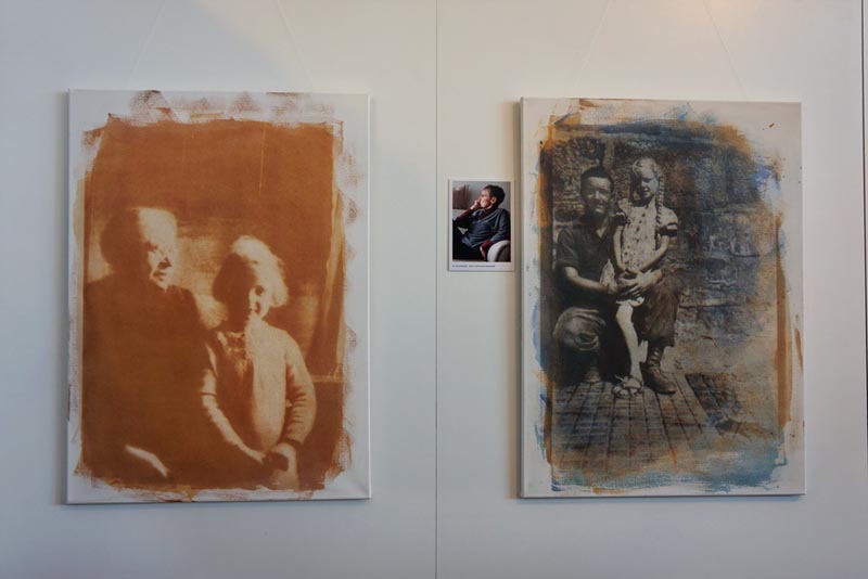 Der Künstler fotografiert die Menschen seiner Wahl zu Hause an ihrem Lieblingsplatz und benutzt dann ein Kindheitsfoto für das spätere Kunstwerk.