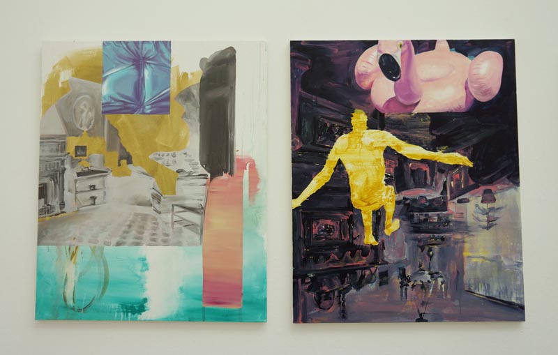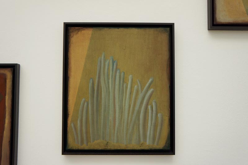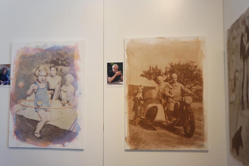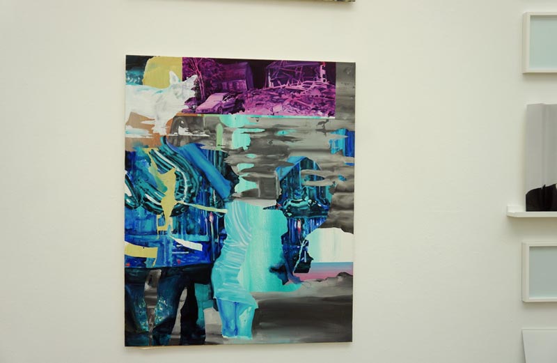 FRANK HELLWIGS Bilder sind im Gummidruckverfahren gestaltet, er vermischt Aquarellfarben mit Gummi Arabicum und transferiert seine Motive mit Licht auf Leinwände. Das Resultat erinnert an unscharfe Fotos mit