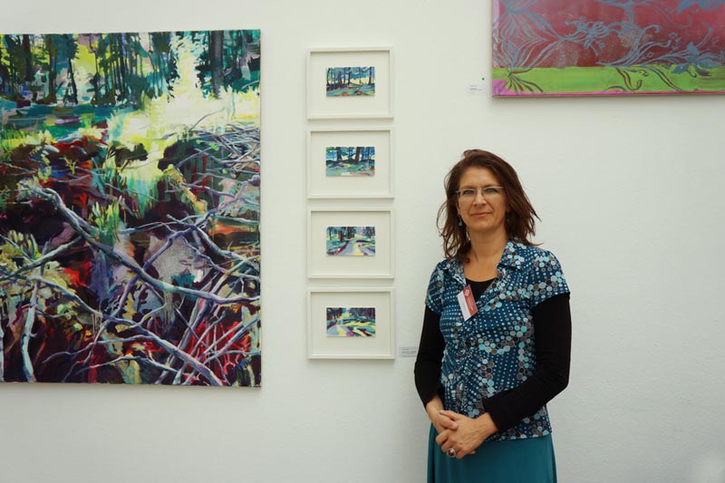 JUDITH ROSAZ malt großflächige, farbenfrohe Naturszenarien in Öl und ihre kleineren Formate gestaltet sie mit Acrylfarben, als künstlerische Besonderheit bespannt sie z.B. ihre Keilrahmen mit einem Stück Spitze imitierender Plastiktischdecke und bemalt die dadurch neu entstandende Oberfläche mit Acrylfarben und erzielt damit einen ganz besonderen Effekt.
