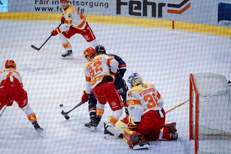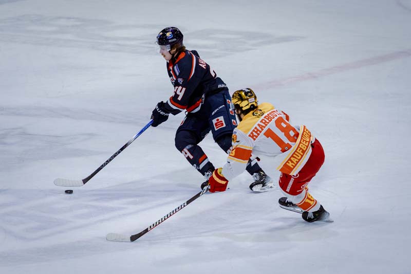 Zu Beginn der Partie begegneten sich beide Teams, wie erwähnt, auf Augenhöhe. Während es die Gäste aus Kaufbeuren hauptsächlich aus der Ferne, von der blauen Linie, versuchten, kombinierten sich die Hausherren mehrfach engagiert vor das Gehäuse von Daniel Fießinger. Die Versuche stellten den Routinier im Kasten des ESVK jedoch vor keine größeren Probleme. So war das erste Tor des Abends auch eher ein Zufallsprodukt. Husky Simon Thiel schaltete hinter dem Kasten der Gäste am schnellsten und überwand Fießinger mit einem altbewährten Bauerntrick zum 1:0 (13.). Und die Führung der Huskies wäre fast noch höher ausgefallen, doch Tim Bender vergab in Unterzahl ein Zwei-auf-Eins-Break (16.).