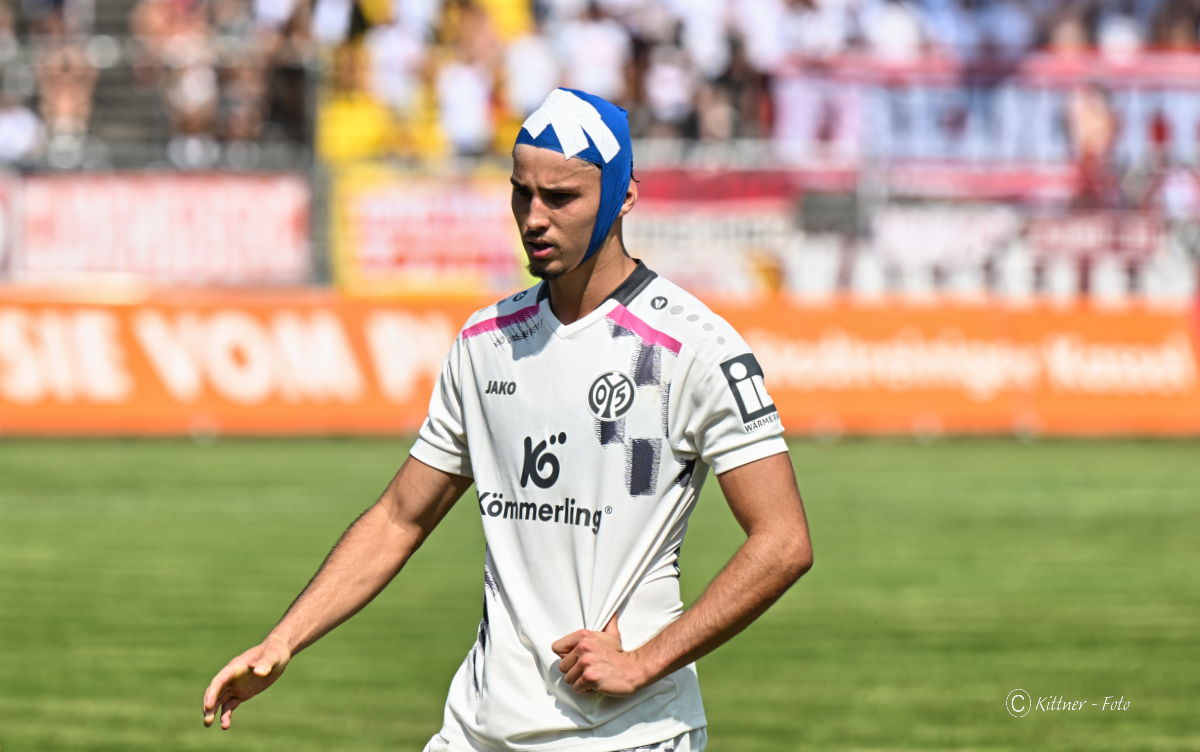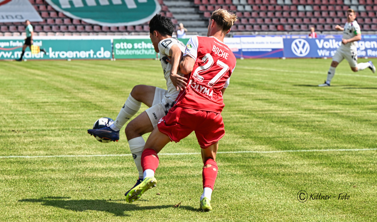 Die Löwen begannen richtig stark. Immer wieder rollten die Angriffe auf das Mainzer Tor, die Gäste hatten zunächst überhaupt keinen Zugriff auf die quirligen Nordhessen. Nach nur neun Minuten die Führung: Eine Flanke von Phiness Bonianga von rechts köpfte der völlig blank stehende Benjamin Girth zum 1:0 in die Maschen. Kurios der zweite Treffer der Gastgeber: Nael Najjar schlug den Ball von rechts nach innen, Philipp Schulz wollte klären und fälschte den Ball unhaltbar für Torwart Maximilian Kinzig zum 2:0 ab. Die Löwen zeigten phasenweise fantastischen Fußball, begeisterten in der ersten Hälfte mit tollen Kombinationen und viel Spielwitz. Bonianga hatte in der 34. Minute Pech, als sein Kunstschuss an den rechten Torpfosten prallte.