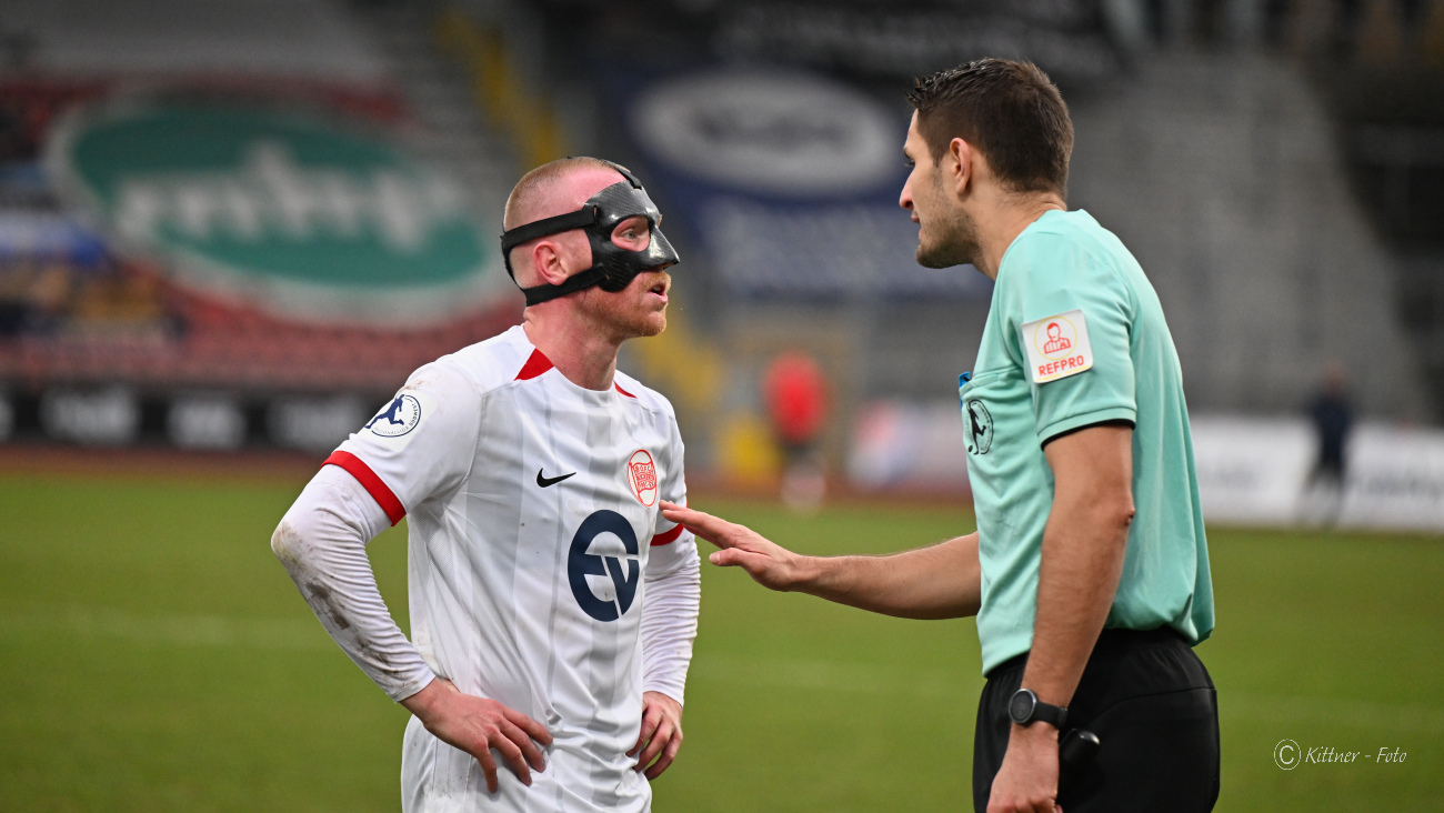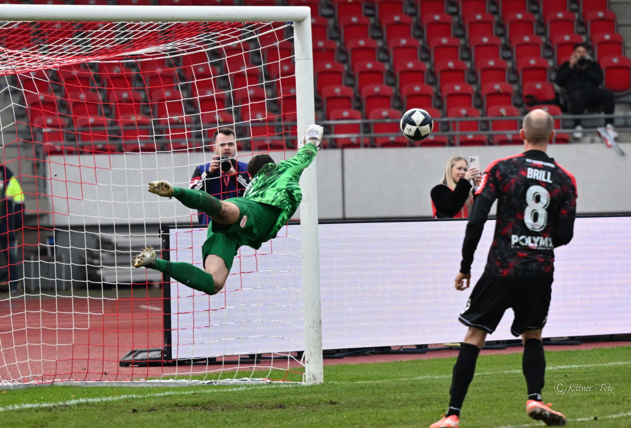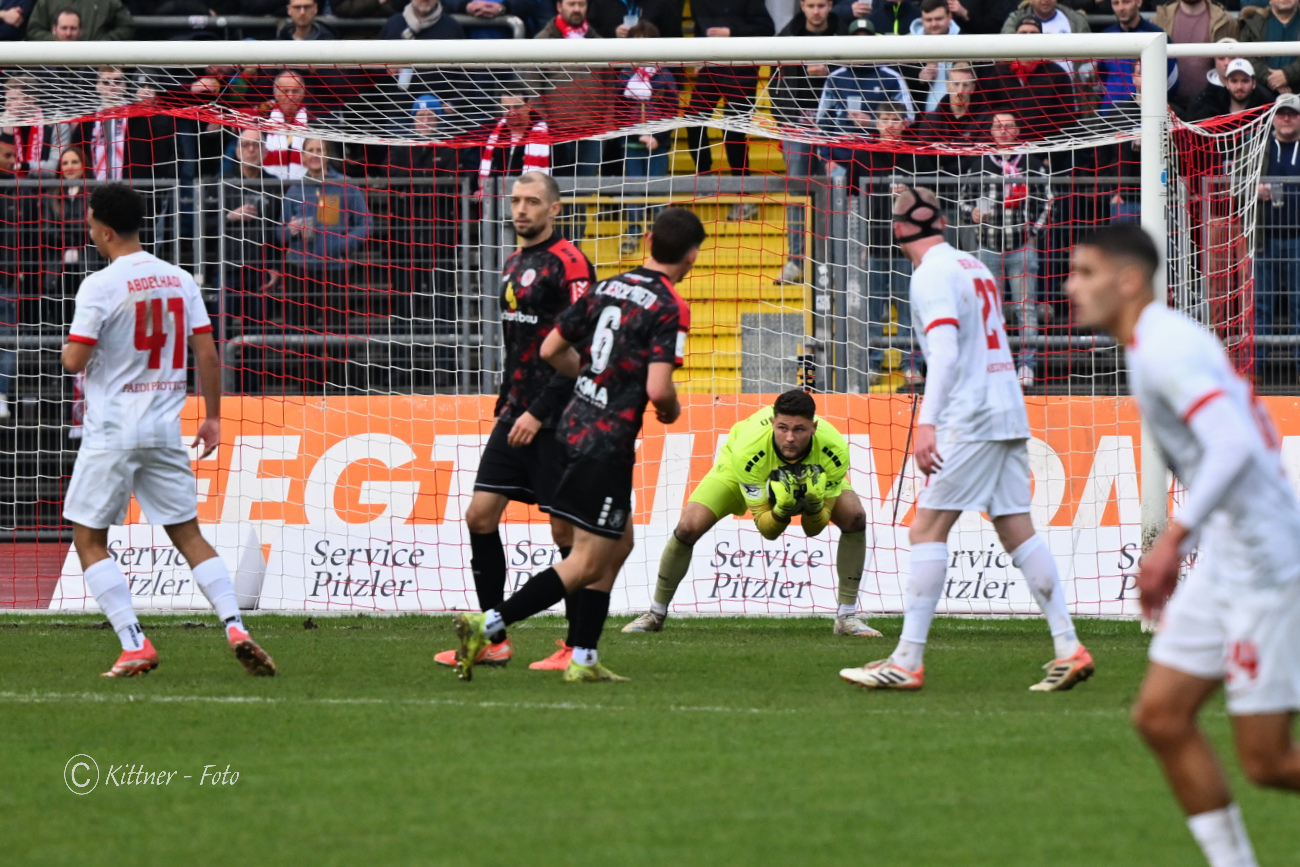 Offenbach hatte nach zwölf Minuten die erste Torchance, als Kilian Skolik nach einer Ecke auf das Tor köpfte und Podolski kurz vor der Linie retten musste. Danach wurden die Löwen zunehmend stärker und setzten die Kickers unter Druck. Pech hatte Yannick Stark in der 25. Minute, als er nach einem wunderbaren Freistoß von Adrian Bravo Sanchez mit einem Kopfball nur den rechten Torpfosten traf. Sechs Minuten später stand Phinees Bonianga plötzlich frei vor Johannes Brinkies, scheiterte aber am OFC-Torwart. Wieder Pech für die Löwen! Und es kam noch dicker. Der direkte Konter der Kickers führte zum 0:1 durch Keanu Staude. Der KSV schüttelte sich und schnürte die Kickers weiterhin in der eigenen Hälfte ein. In der 39. Minute der nächste Pfosten-Treffer der Löwen, als Bonianga Brinkies ausspielte, aber aus spitzem Winkel wieder nur das Aluminium traf.