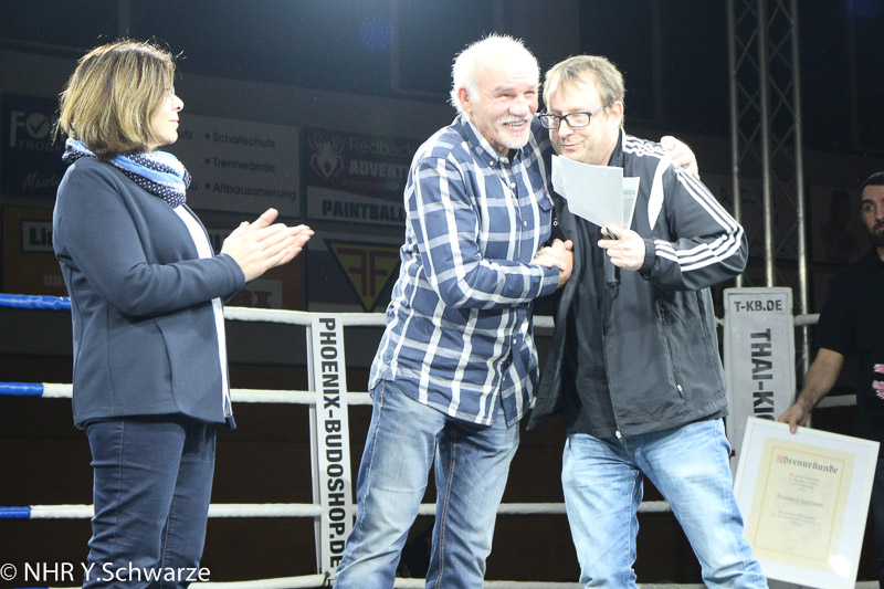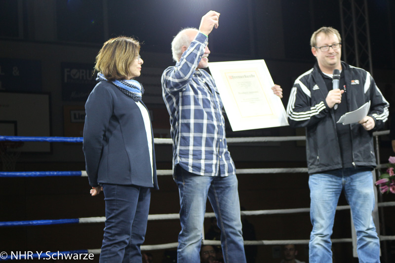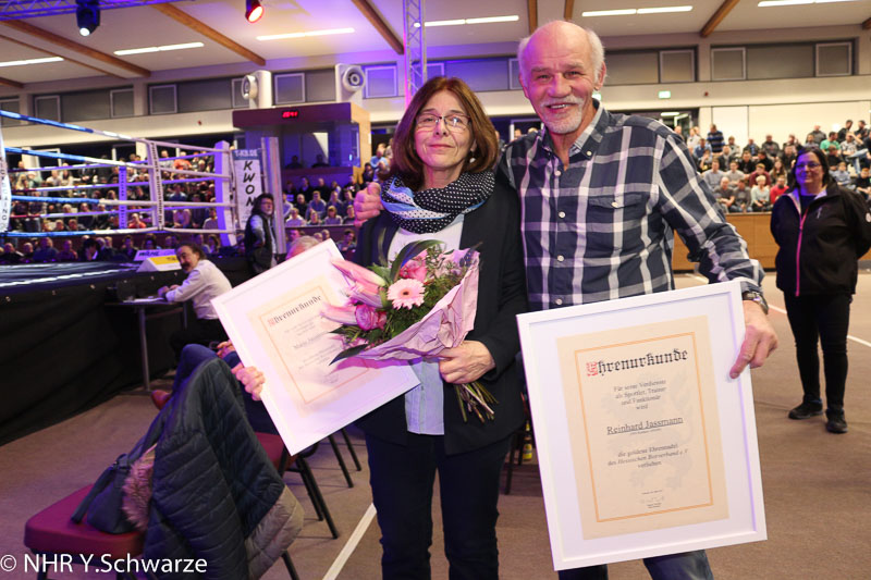Reinhard Jassmann, der Vater von Mario Jassmann, und seine Frau Karin wurden an diesem Abend für ihre außerordentlichen Leistungen im Boxsport geehrt und mit der goldenen Ehrennadel des Hessischen Boxverband e.V. ausgezeichnet.