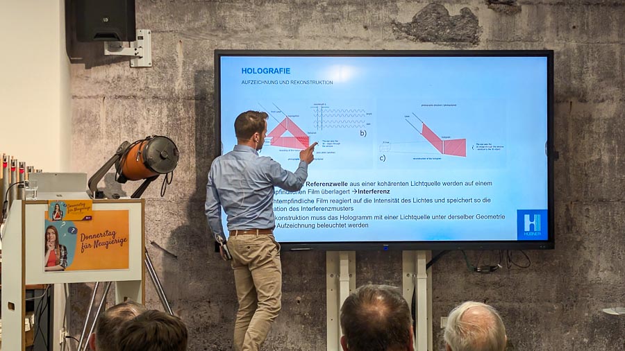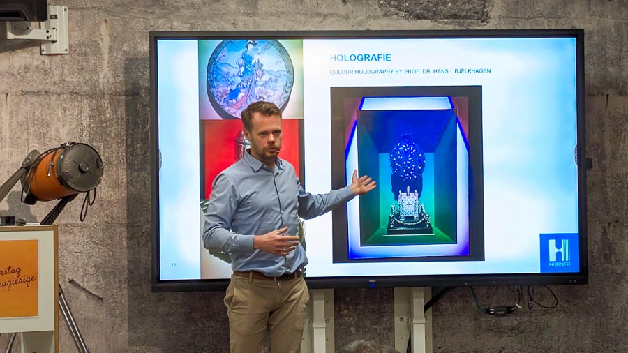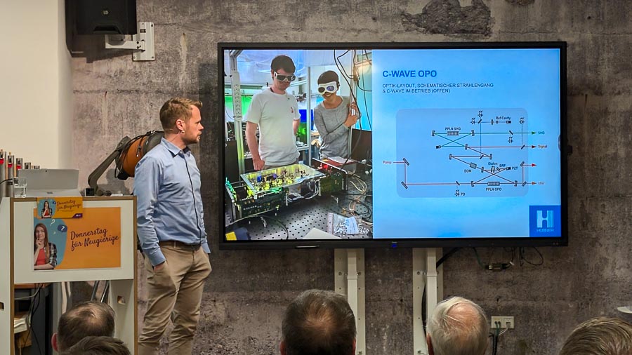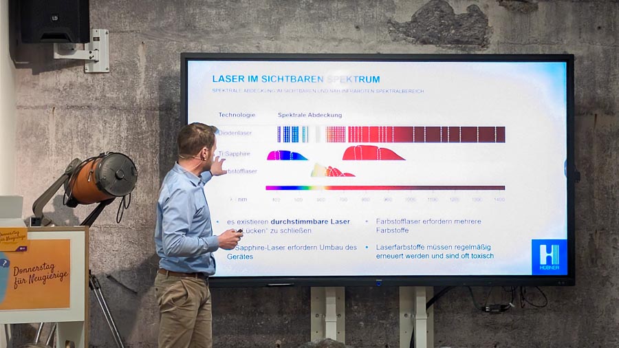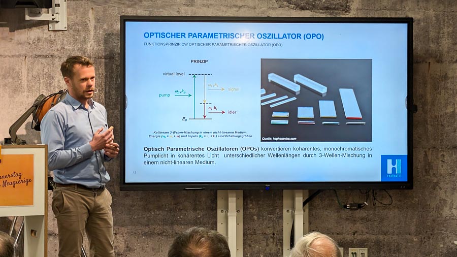 Im Vortrag erklärte Dr. Waasem die verschiedenen Lasertypen und ihre Funktionsweise, die für diese zukunftsträchtigen Technologien entscheidend sind. Besonders in der Forschung und der Entwicklung innovativer Produkte sind durchstimmbare Laser wie der „C-WAVE“ heute unverzichtbar. Diese Technologie eröffnet neue Möglichkeiten, vor allem in der Entwicklung hochmoderner Anwendungen. Ein herausragendes Beispiel hierfür ist das Gemeinschaftsprojekt von HÜBNER und ZEISS Microoptics, bei dem holographische Displayelemente für die Fenster von Bussen und Bahnen entwickelt werden.“