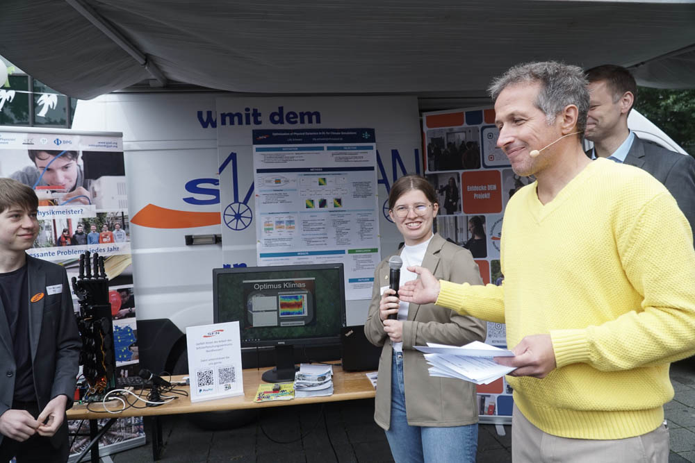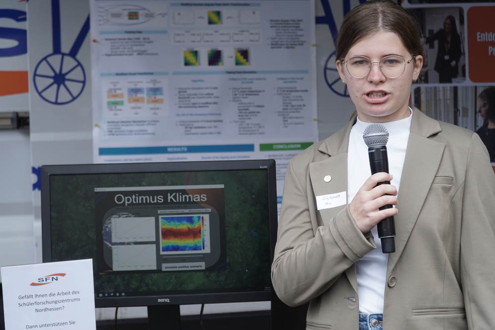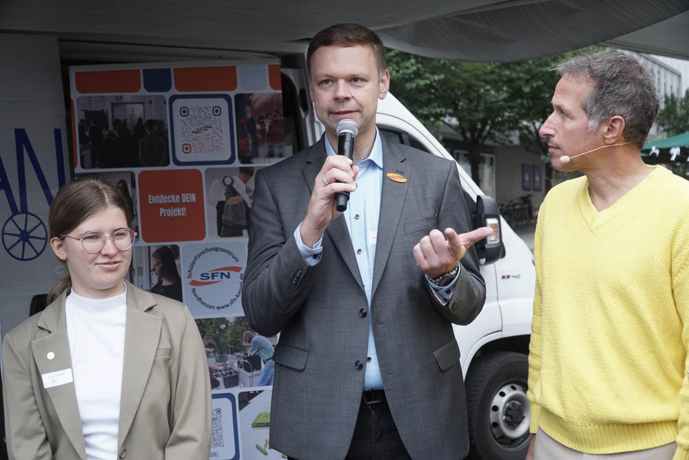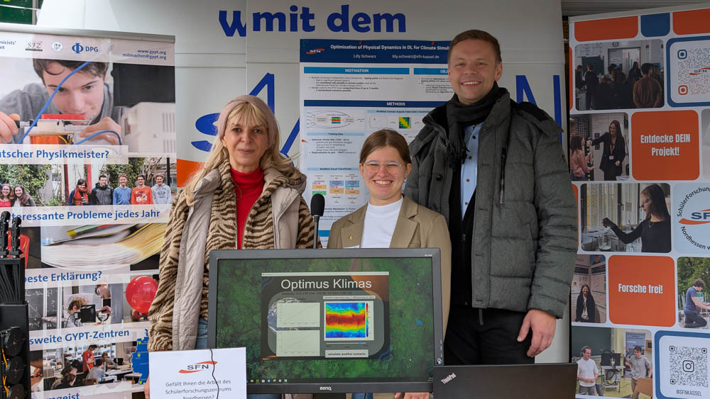 Ein weiterer Programmpunkt war der Stand des Schülerforschungszentrums Nordhessen, an dem Philipp Imhof und Lilly mit ihrem Projekt „Optimus Klimas“ sowie Tom mit seinem Projekt „Mit der Hand hören – Roboter-Gebärden-Hand“ Einblicke in ihre Arbeiten gaben. Außerdem präsentierte das Future Space einen Stand mit Rico Janusch und Cornelia Kramm-Rettberg, an dem das „Frag Mal Mat“ Large Language Model vorgestellt wurde.