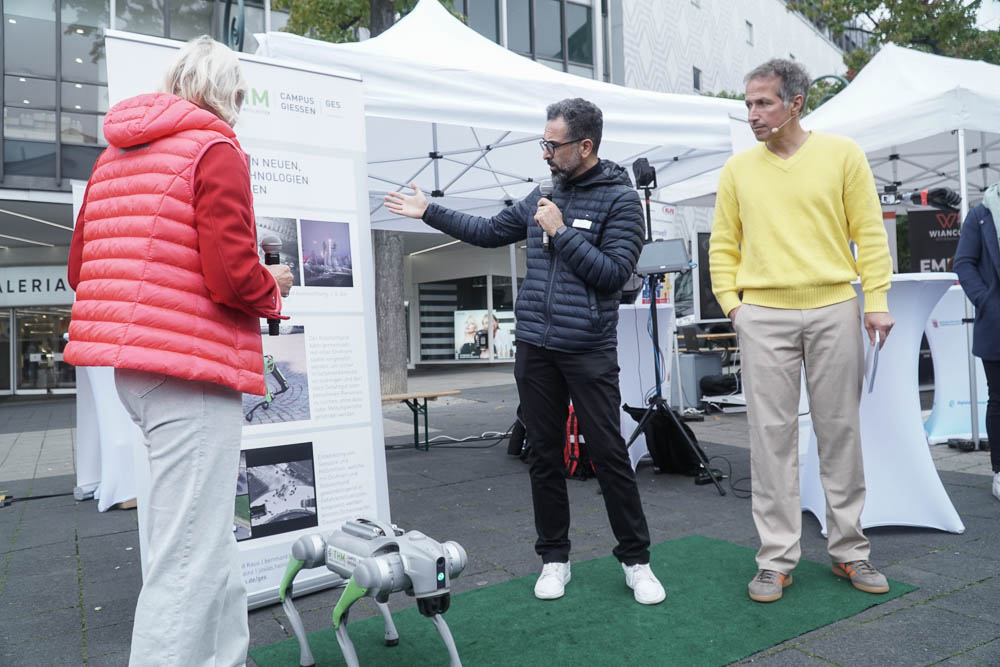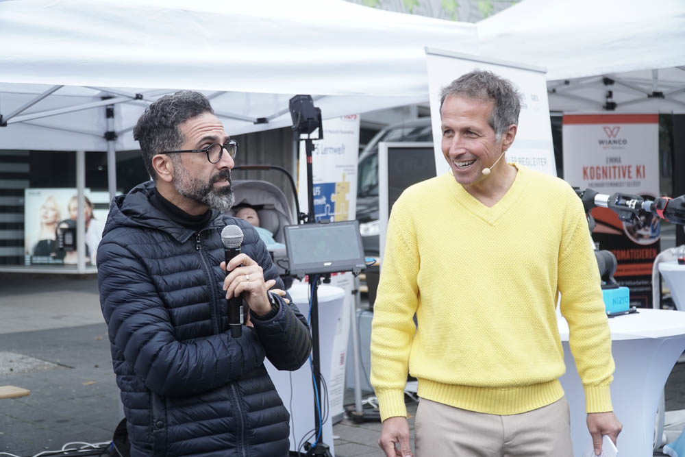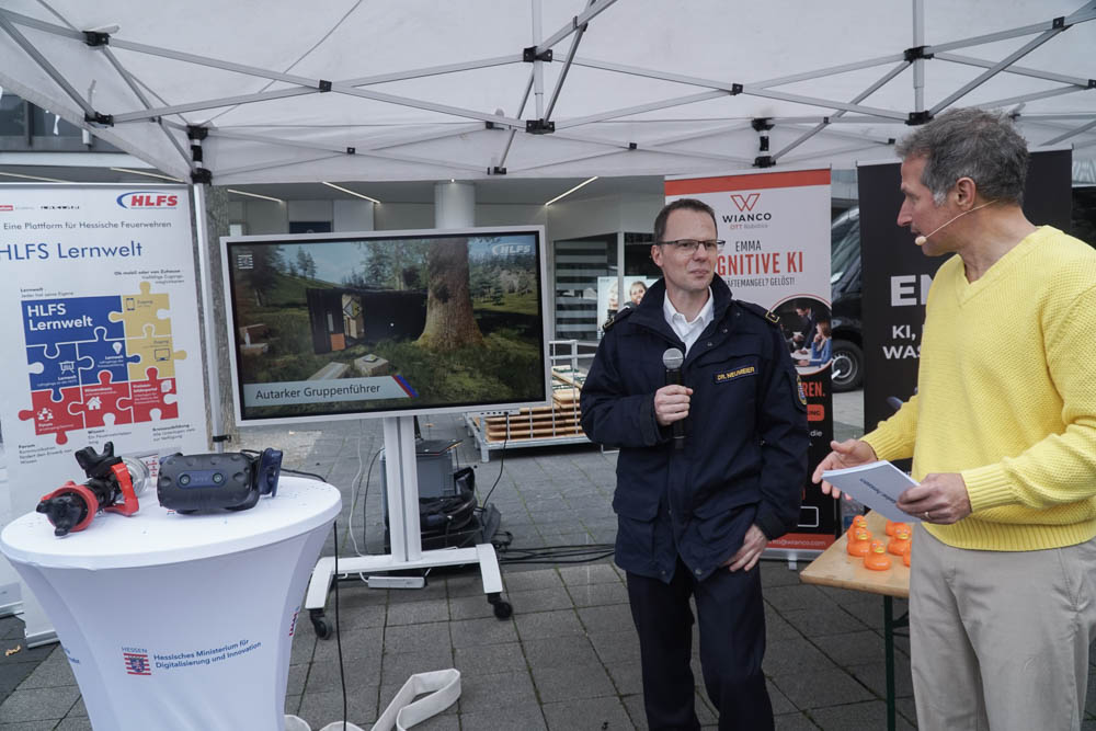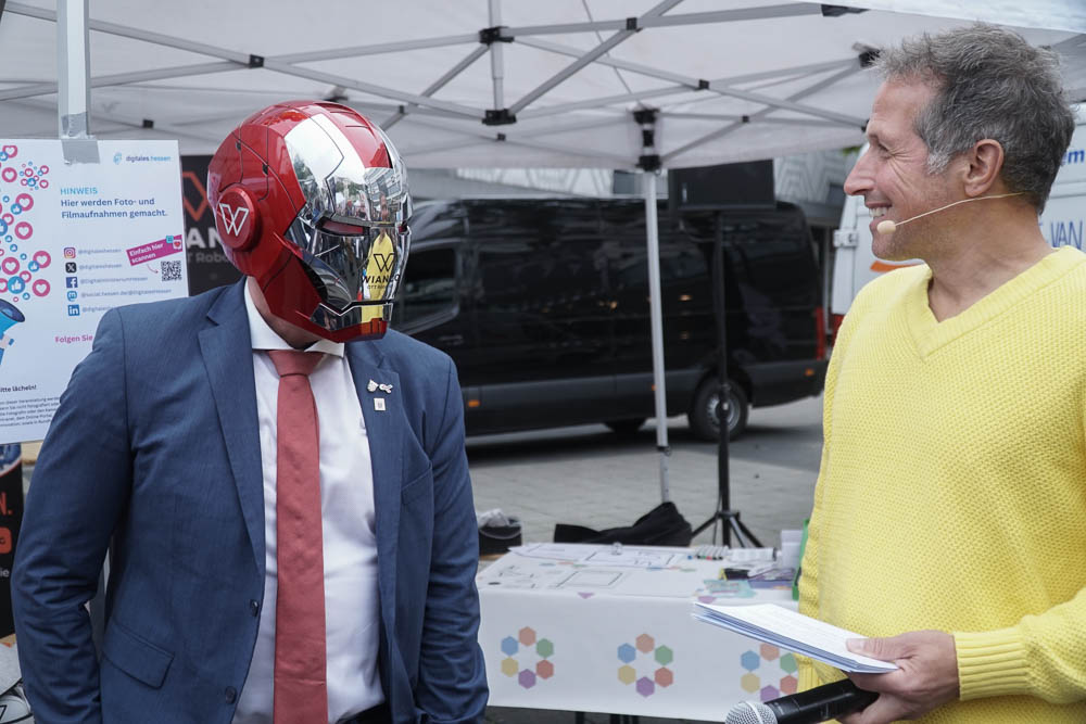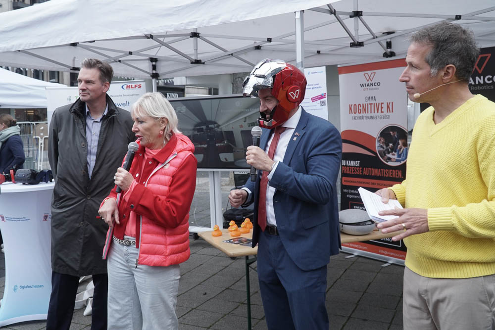 Nach einleitenden Worten von Oberbürgermeister Dr. Sven Schoeller, Digitalministerin Prof. Dr. Kristina Sinemus und Willi Weitzel, bekannt aus der Sendung „Willi wills wissen“, wurde das Programm eröffnet. Der Opernplatz in Kassel war Schauplatz eines abwechslungsreichen Programms. Dort konnten die Besucherinnen und Besucher erleben, wie vielfältig KI bereits in den Alltag integriert ist: Ein Roboterkopf, der in 40 Sprachen kommunizieren konnte, ein Assistenz-Roboter, der durch Bewegungen gesteuert wurde, bot spannende Einblicke in die Technik von morgen. Auch ein virtueller Blick auf den Arbeitsplatz der Zukunft und ein interaktives Quiz, das spielerisch Wissen vermittelte, gehörten dazu.