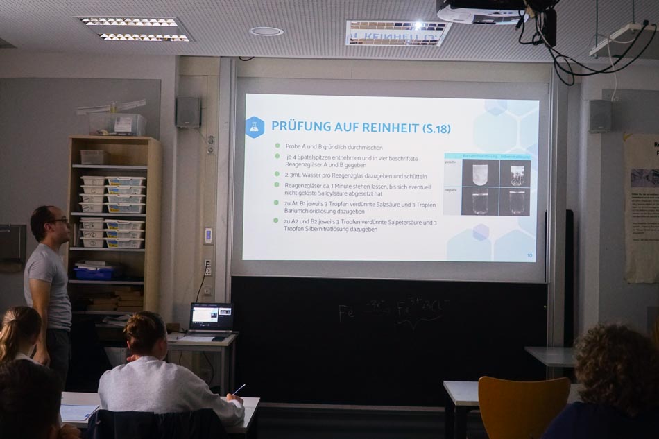 Besonderes Interesse weckte der Workshop „Von der Idee zum eigenen Medikament“, bei dem Jugendliche praxisnah in die Welt der Arzneimittel eintauchten. Unter fachkundiger Anleitung von Florian Fox wurde vermittelt, was Pharmazeutika sind, wie Wirkstoffe entdeckt und synthetisiert werden und welche Schritte von der ersten Idee über die Wirkstoff-Synthese bis hin zur Formulierung und Analyse nötig sind. Neben theoretischem Wissen stand auch die Praxis im Vordergrund – so gehörte das Herstellen von Aspirin zu den besonderen Höhepunkten. Themen wie Wirkungsweise, Nebenwirkungen und Qualitätskontrolle wurden ebenso behandelt. Unter einem Mikroskop betrachtet, zeigt Aspirin (Acetylsalicylsäure) in kristalliner Form farblose, nadelförmige Kristalle.