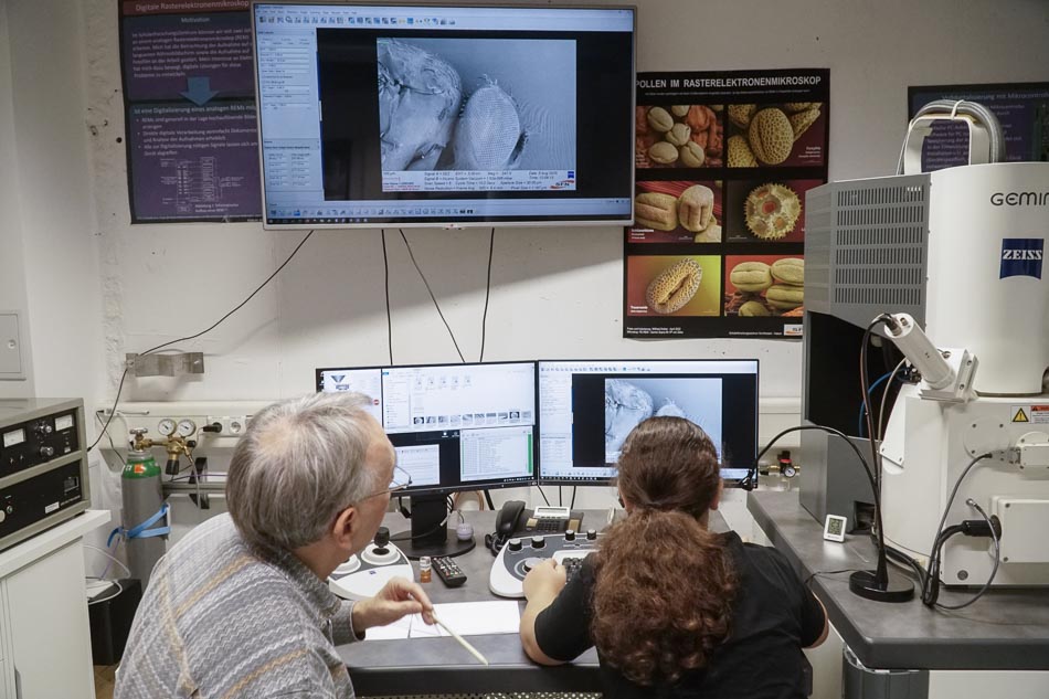 Im Workshop „Zoom ins Unsichtbare“ erklärte Wilfried Dreher den Teilnehmerinnen die Funktionsweise und Anwendung des Rasterelektronenmikroskops (REM). Dieses leistungsstarke Gerät ermöglicht es, Strukturen sichtbar zu machen, die mit herkömmlichen Lichtmikroskopen nicht zu erkennen sind. Statt Licht nutzt das REM Elektronen, um die Oberflächen von Proben detailreich abzubilden.