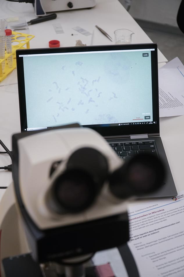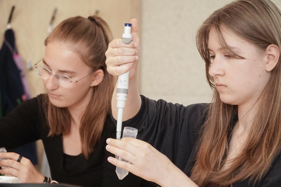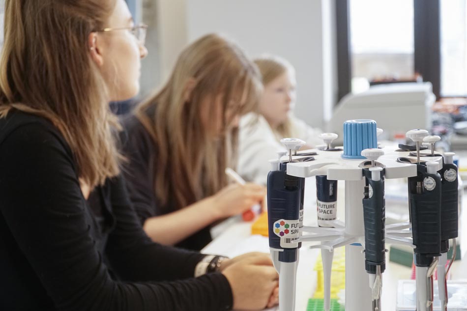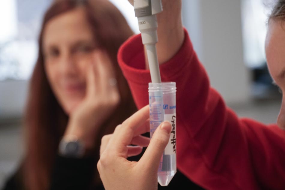 Im Future Space lerneten die Jugendliche unter der Leitung von Dr. Heike Ziegler ein Workshop zum Thema „DNA-Lab: Das Molekül des Lebens –isolieren und analysieren“ . Der Schwerpunkt des Kurses lag darauf, den eigenen genetischen Fingerabdruck zu entdecken und die zugrundeliegenden biotechnologischen Methoden kennenzulernen. Die Kursteilnehmerinnen isolierten zu Beginn ihre eigene DNA aus Zellen der Mundschleimhaut. Nach einer Reihe von Reinigungsschritten war die isolierte DNA im Reagenzglas sichtbar.
