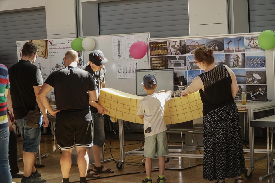 Im Bereich Maschinenbau konnten die Besucherinnen und Besucher beim Team Racoon Rocket eine selbst konstruierte Wasserrakete bestaunen. Ziel ist es, einen neuen Höhenrekord zu erzielen – dafür braucht es Wissen über Aerodynamik, Strömungsmechanik sowie Dynamik und Mechanik. Träger des Projektes sind die Fachgebiete Strömungsmechanik (StM) und Technische Dynamik (TD) des Instituts für Mechanik.